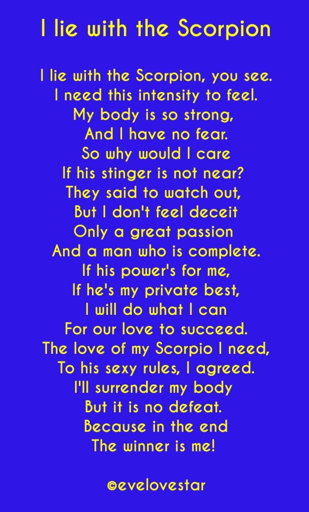 This poem explains it best. I call the goddess into my space, I connect to Love, then he connects to me. This is sex magic and bringing a very sexy spirit into our bed for play. You wonder if Scorpio has an issue with this? lol Scorpio lives to connect to a mysterious feminine essence, he needs this, he is hooked. He has been looking for the goddess, he didn’t realize it like that, but he has been working with her, is what she said to me.