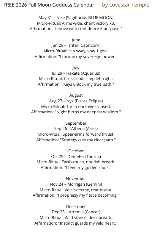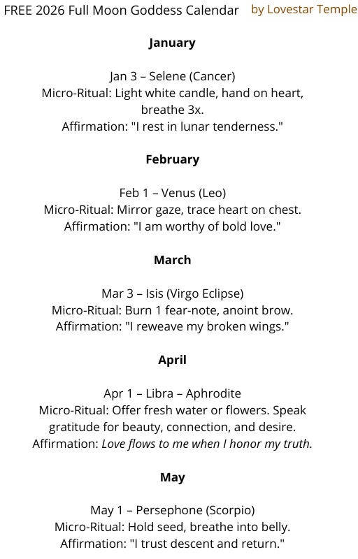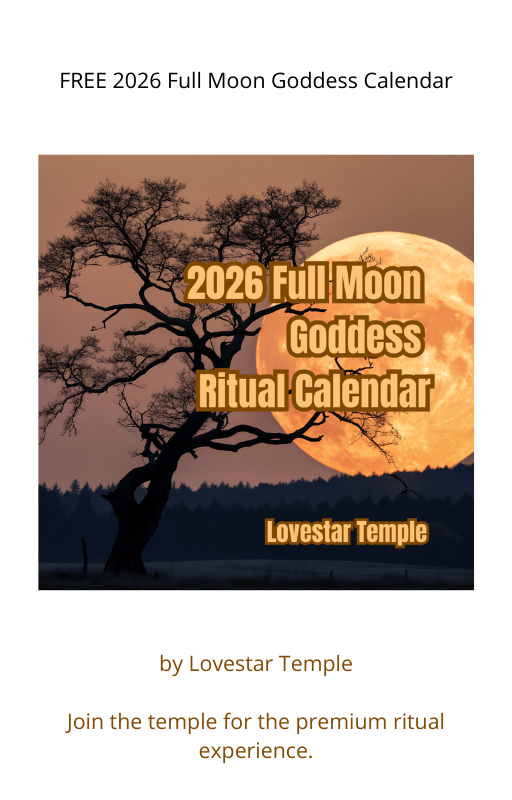 If this speaks to you, you can get the 2026 Full Moon Goddess Calendar as a digital ebook for $7. It contains all thirteen full moon rituals, eclipse and blue moon specials, journal prompts, affirmations, and goddess messages.