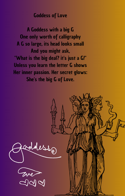 I learned from a graphologist that the way we write the g signifies our sexual appetite, so I carefully drew the exaggerated G that would signify a larger-than-life sexual appetite (to mean the sexual appetite of a Goddess of Love. Did you notice that?