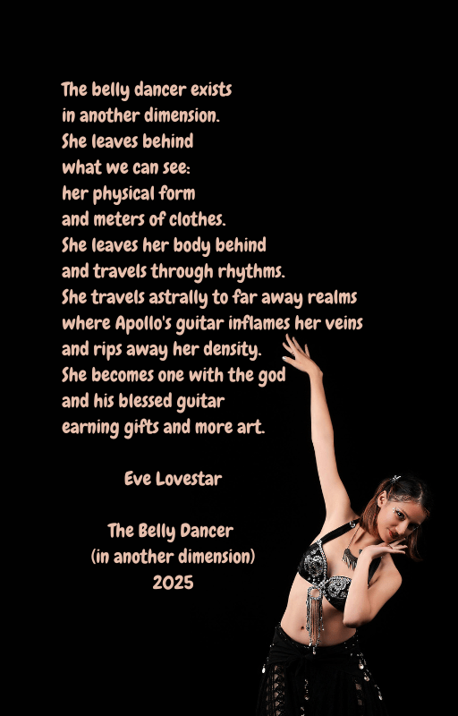 This poem paints the belly dancer as a mystical being who transcends the physical world through movement. As she dances, she sheds her earthly weight and steps into a divine realm, where music isn’t just sound, it’s spiritual fire. In that space, she fuses with the god of light and song, receiving inspiration, transformation, and the kind of art that comes from another world.