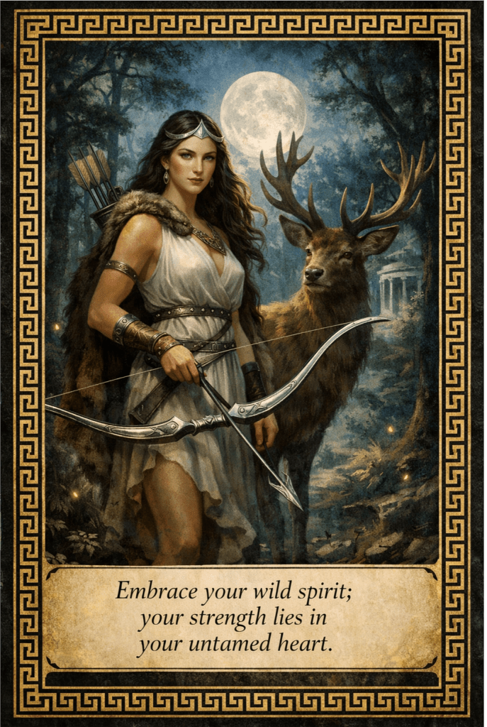 (See her below: moon-crowned huntress, stag at her side, fireflies glowing. “Embrace your wild spirit; your strength lies in your untamed heart.”)