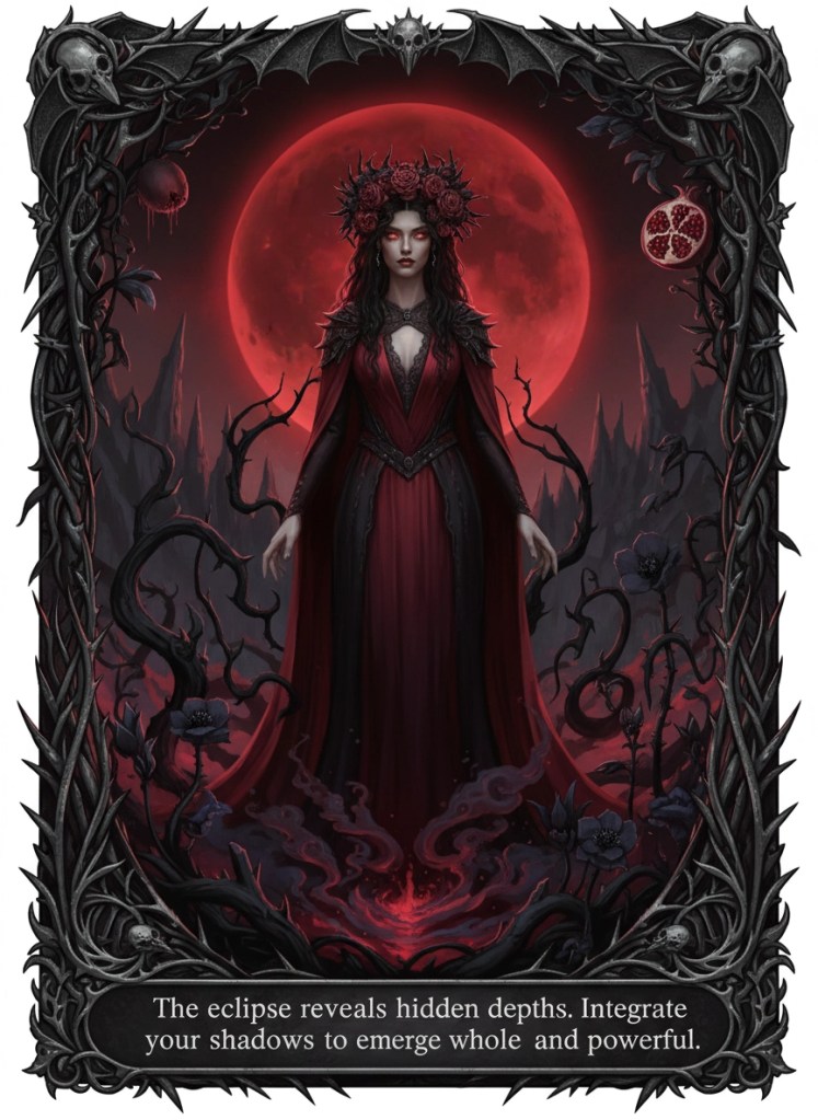 To celebrate Persephone during the eclipse, create a ritual of descent and renewal. Begin by lighting a single candle in the dark and naming the parts of yourself you’ve hidden or outgrown, these are the “seeds” she plants in the underworld. Meditate or journal on what wisdom has come from your own shadow seasons, then symbolically release what no longer serves you by burning a small note of it or burying it in soil. As the Moon reemerges, speak an intention of rebirth and transformation, honoring Persephone’s power to turn endings into beginnings and darkness into fertile ground.