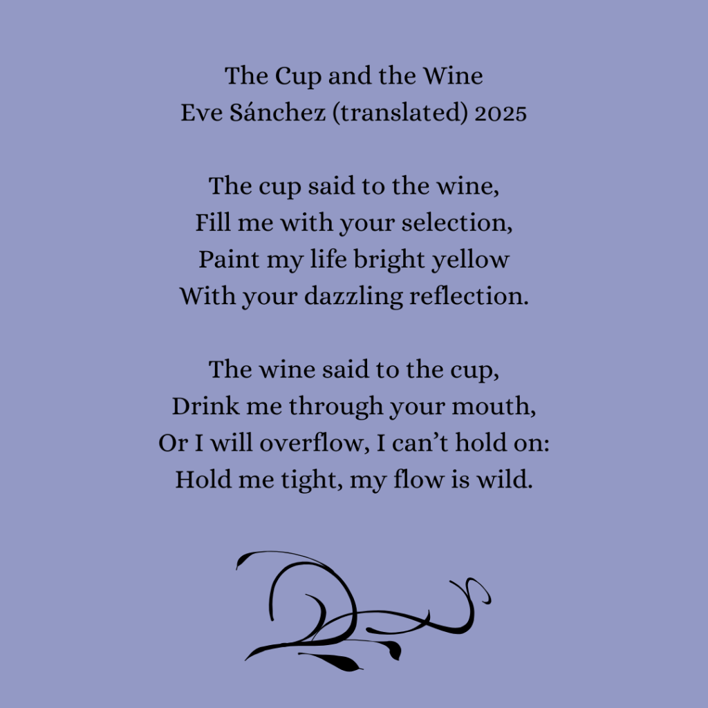 This poem in the lovely Spanish language contains a clever word game. “Vino” which means wine is also a verb in Spanish which is the past tense of the verb “venir” to come for the third person singular.